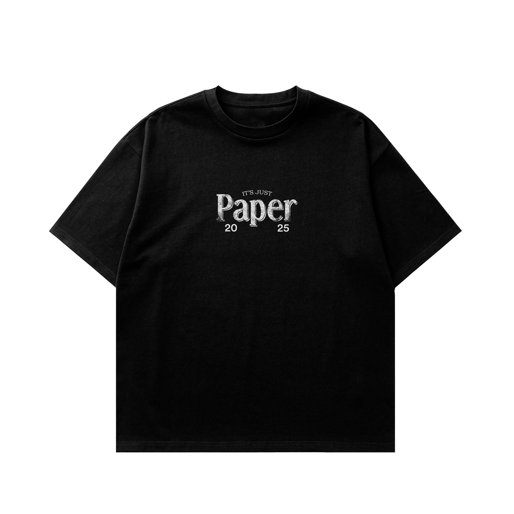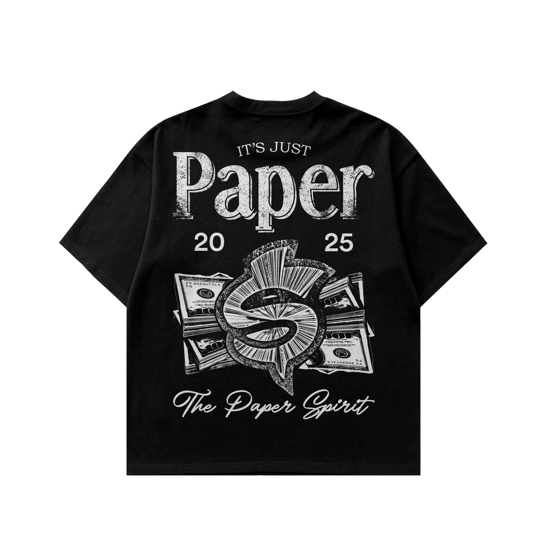 Black heavyweight tee featuring the bold It’s Just Paper 2025 graphic. Front and back prints with stacked money artwork and “The Paper Spirit” script. Built for those chasing goals,  because in the end, It's just paper.