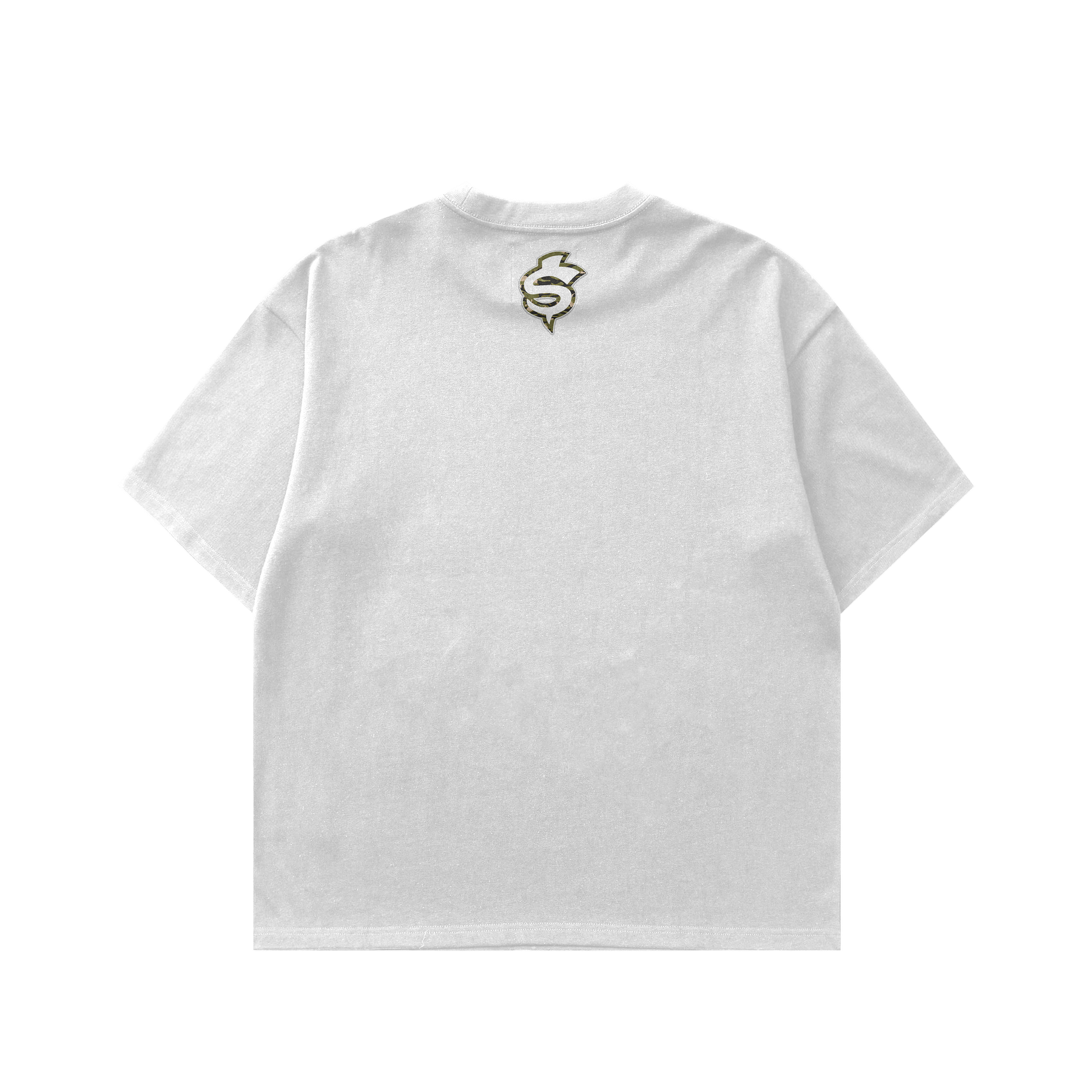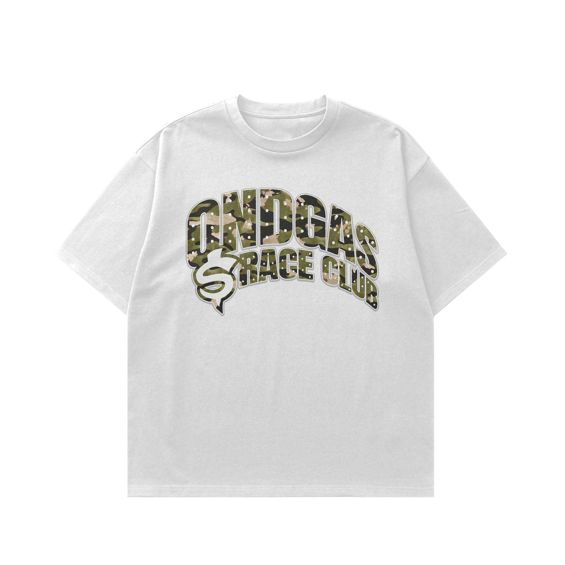 Clean white heavyweight tee featuring the bold OnDgas Race Club logo in camo print. Subtle $ emblem detail on the back neck. Premium cotton build with a relaxed fit.