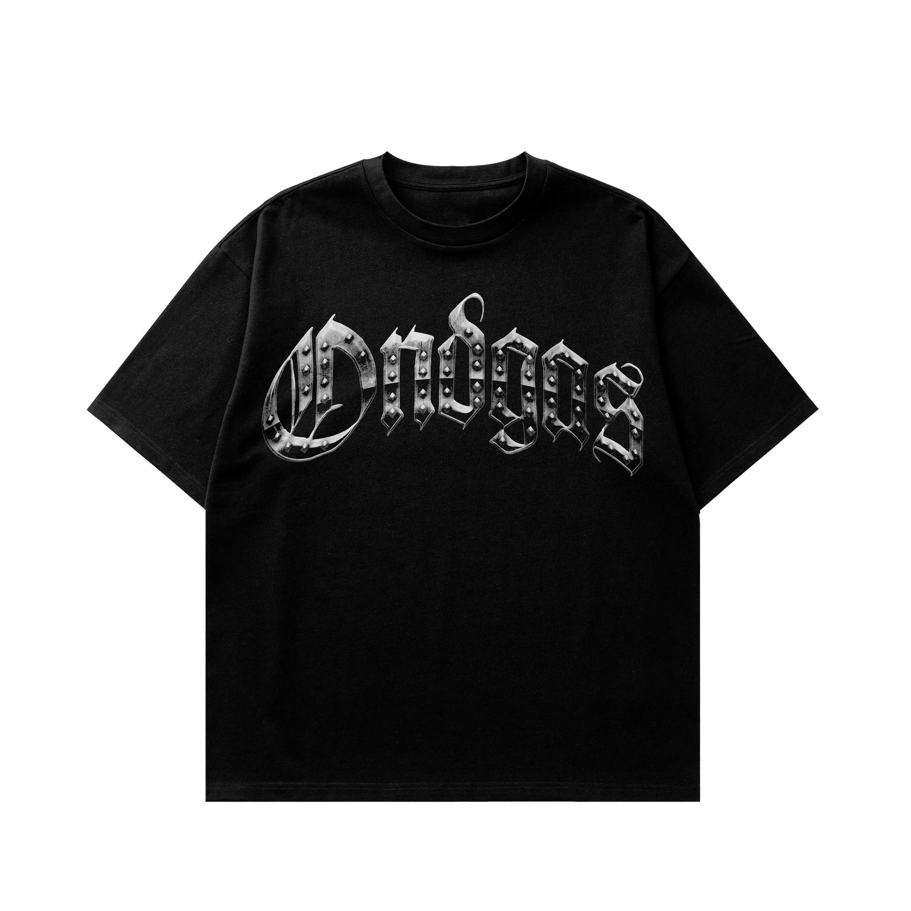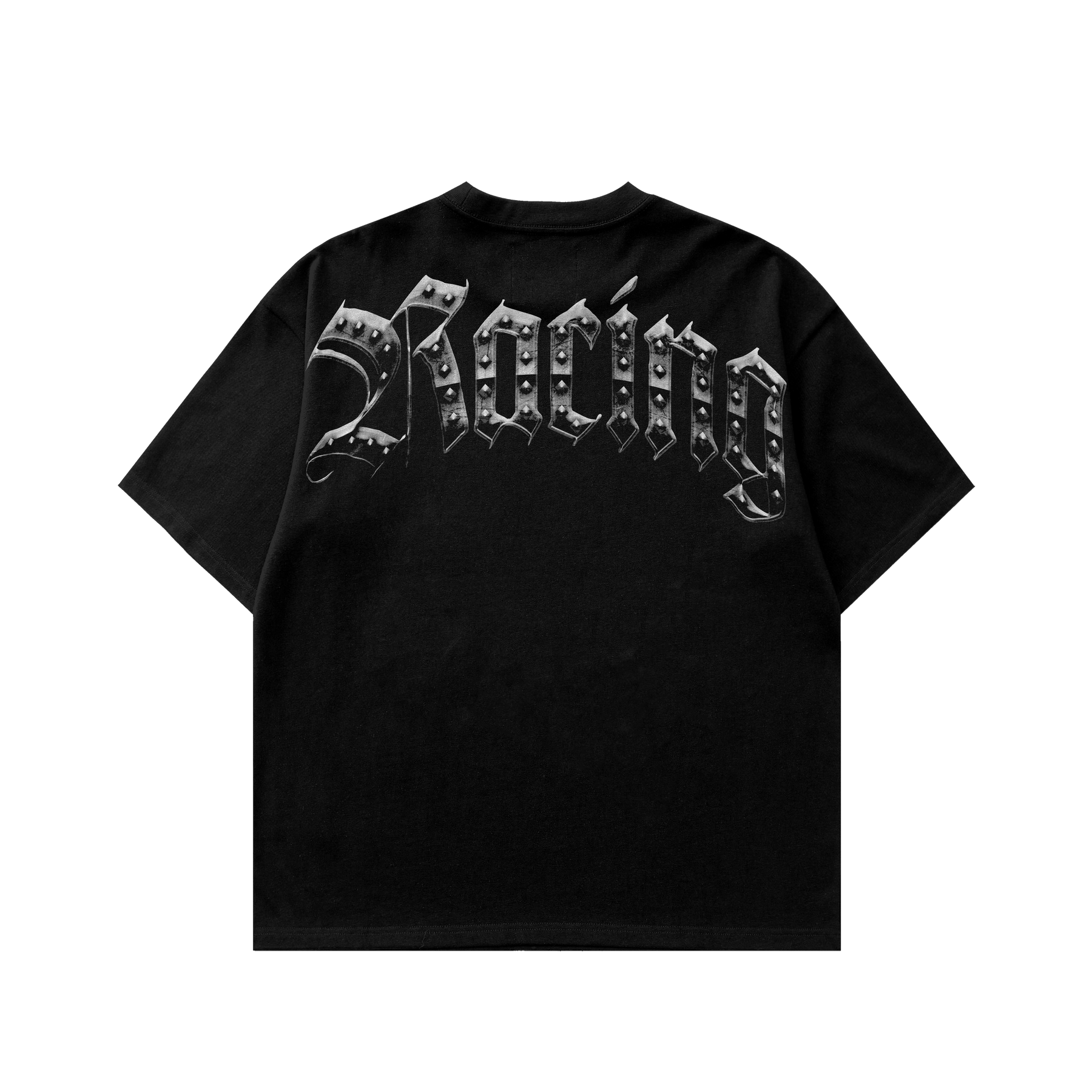 Heavyweight black tee featuring metallic gothic “OnDgas” front print and bold “Racing” back design. Built with premium cotton for a structured fit
